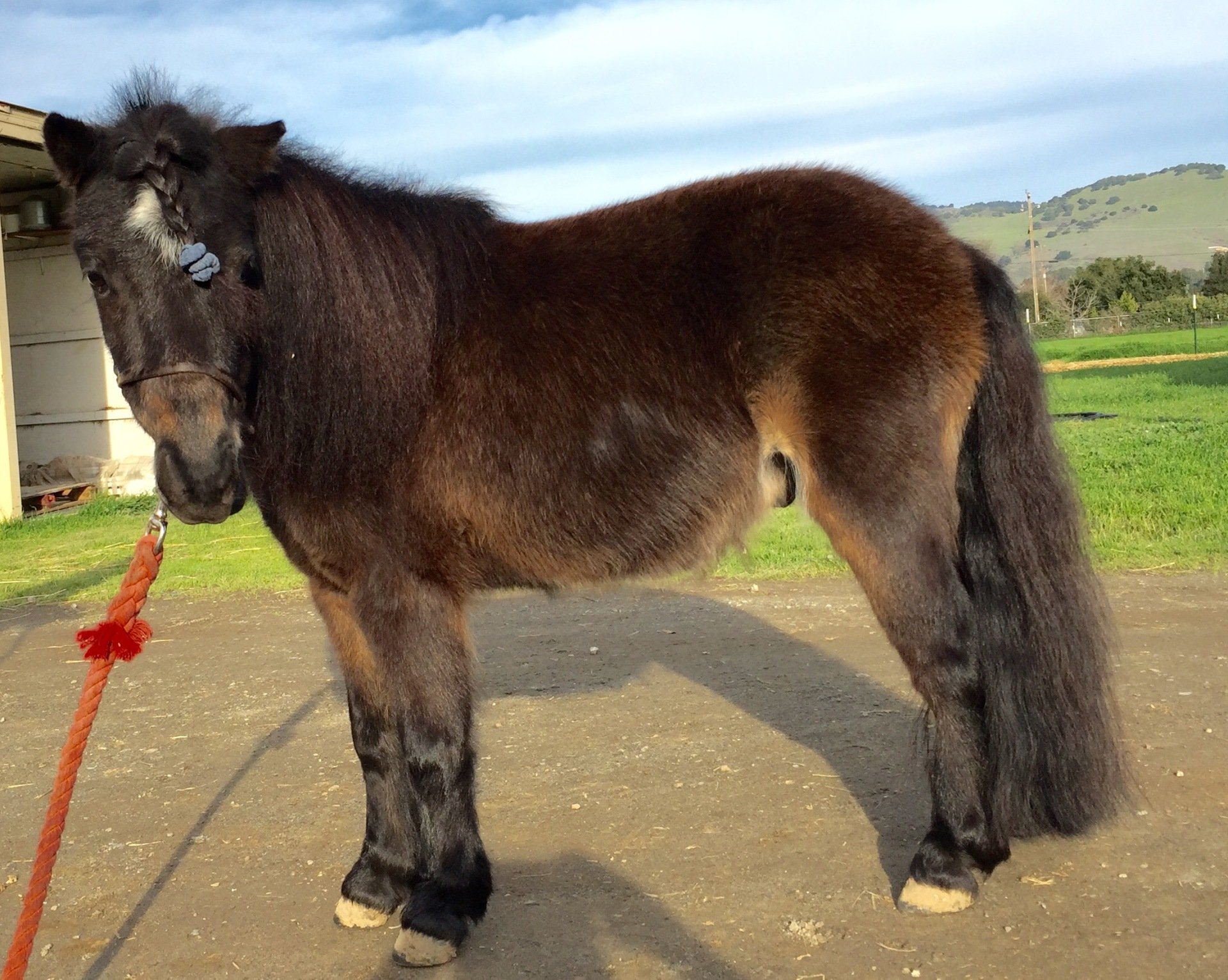 Yaya was part of a herd of miniature horses rescued by the Peninsula Humane Society, and we adopted her in 2009. Since Yaya is a rescue, we don't know her exact birthday, but the veterinarians estimate she was born sometime towards the end of 2008. She was named in honor of a little girl we met during a visit to Ronald McDonald House. Unbeknownst to us, Yaya was in foal when we adopted her, which brought us Henry. Yaya is our resident musician giving "Lady Yaya" performances where she plays an electronic keyboard with her nose.