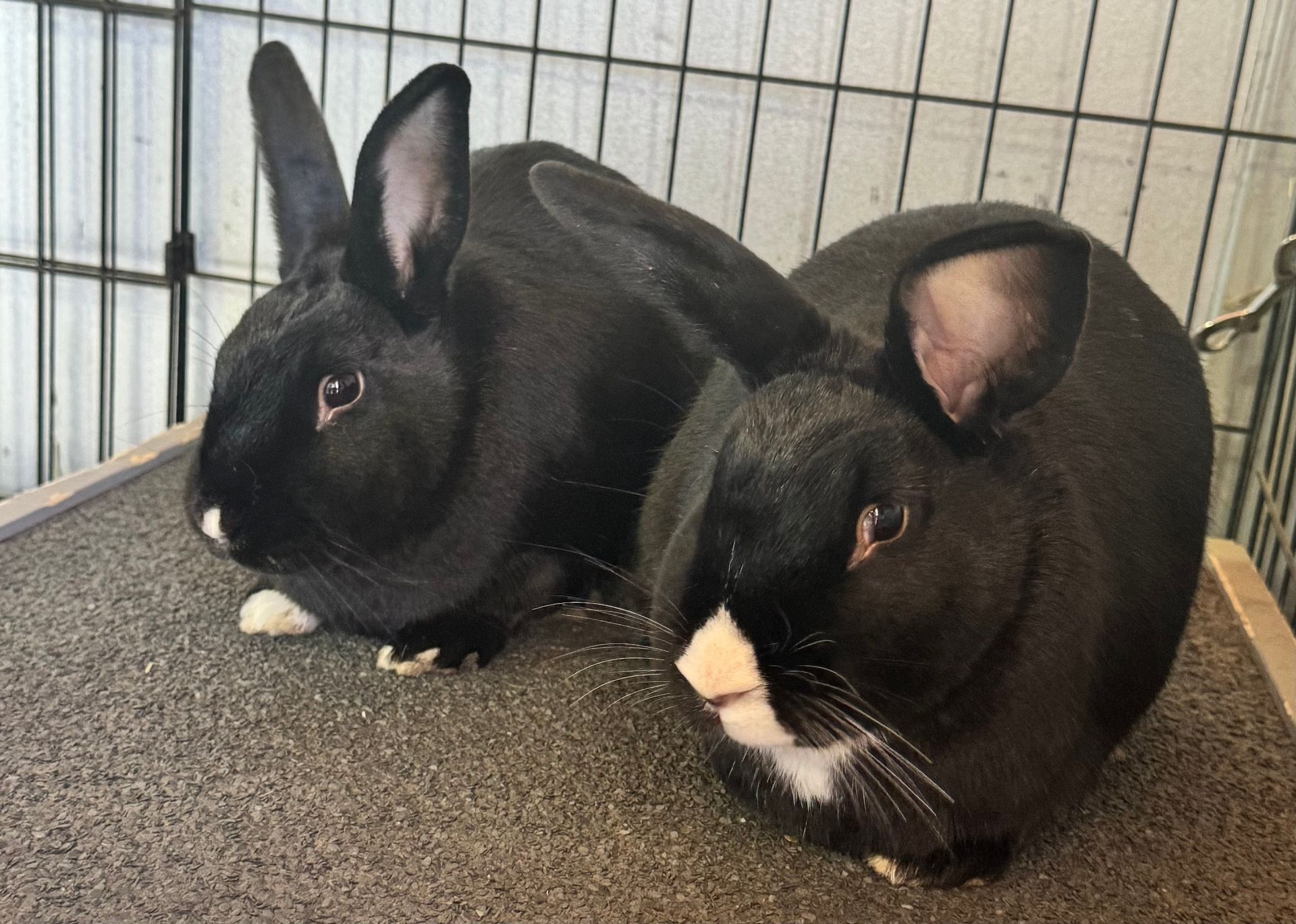 We adopted this bonded pair from the Peninsula Humane Society in the fall of 2023. They are friendly, soft and ever popular. They are also quite athletic and entertain themselves by jumping over high fences and onto the top of their hutch.