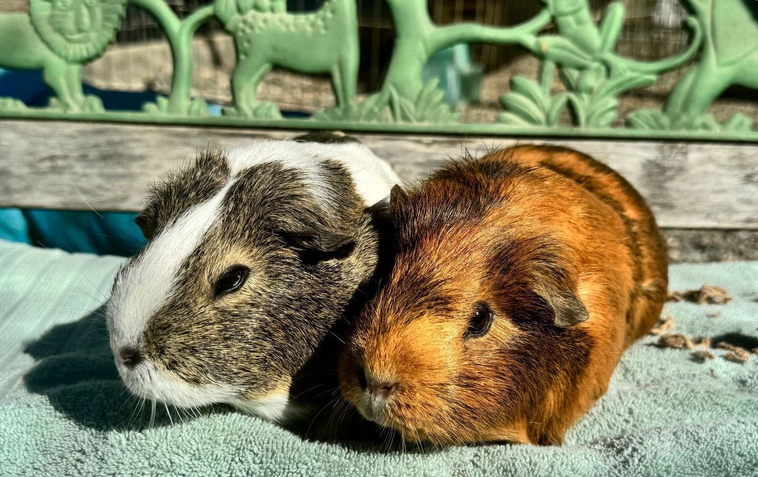 We adopted this bonded pair from the Peninsula Humane Society in the fall of 2023. They are friendly, soft and ever popular. They are also quite athletic and entertain themselves by jumping over high fences and onto the top of their hutch.